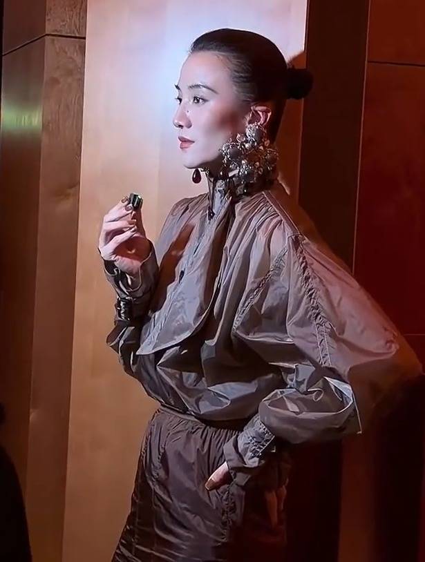 比如这次她就选择了一件款式很有设计感的聚酰胺花结衬衫,搭配上铅笔裙,还有特别显眼的宝石耳环和漆皮尖头高跟鞋,这种冷御摩登风格在内娱很少有人能驾驭。