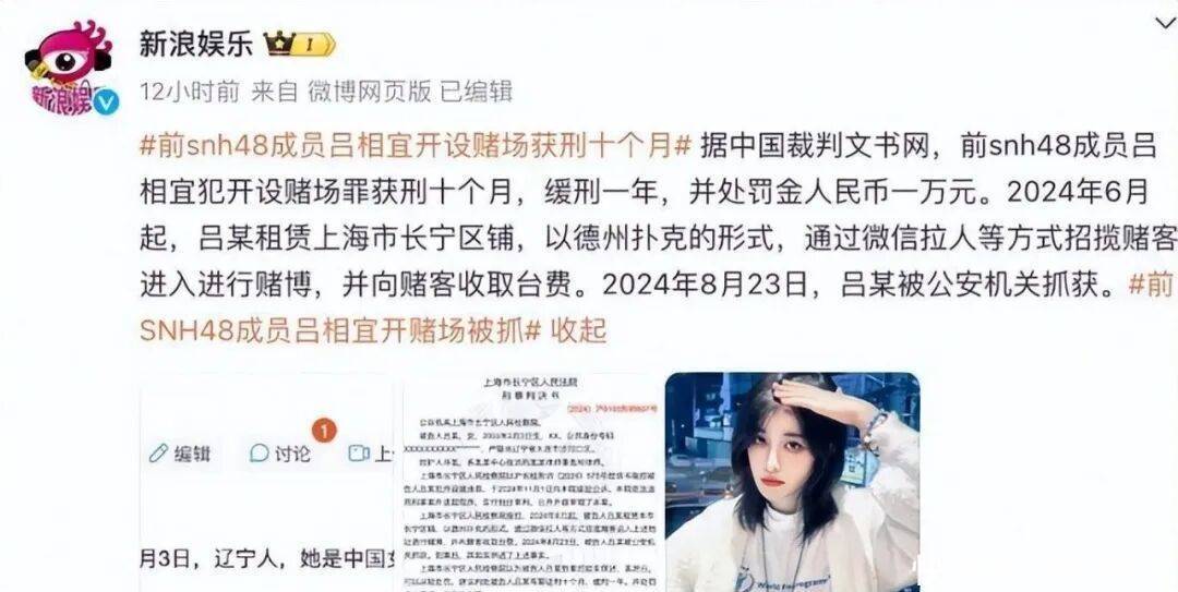 2025年1月,法院以开设赌场罪判处其有期徒刑十个月,缓刑一年。