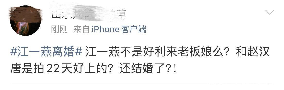江一燕也曾因为“事业没啥顺利的机会,婚姻也告吹”而陷入自我怀疑的低谷。没想到江一燕刚一宣布离婚,没满24小时,网友们就噼里啪啦地展开热烈讨论,评论区里全是梗,还牵扯到杜江、霍思燕他们也难免被牵扯进去。江一燕刚一公布离婚消息,许多网友第一反应就是震惊。有位网友就说了:“江一燕不是好利来的老板娘嘛?和赵汉唐是拍了22天戏就搭上了?竟然还真的结婚了?”