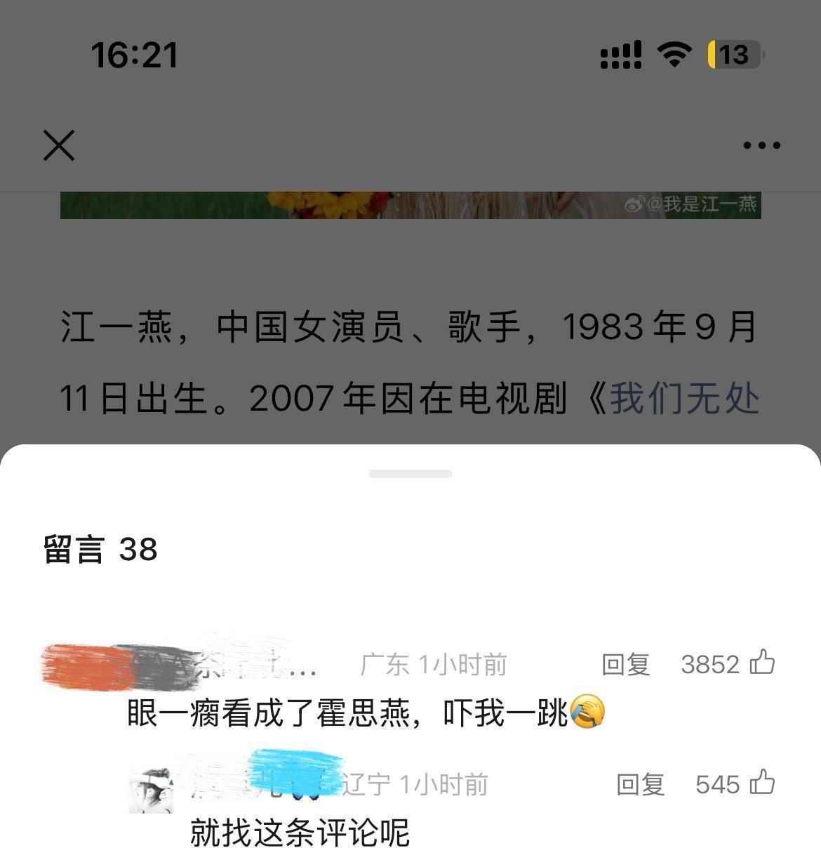 遇到类似情况也不奇怪,在一条官方媒体的报道底下,热评榜上第一条留言就写着:“眼一瞟还以为是霍思燕,吓我一跳。”不止一个人在认错,下面还陆续有人回复:“就看这条评论呢”、“我也是,被吓了一跳。”大家对于江一燕离婚这个消息的反应五花八门,有惊讶的,也有人毫不在意的,还有一些人在说些难听的话,还牵扯到其他人,是不是?