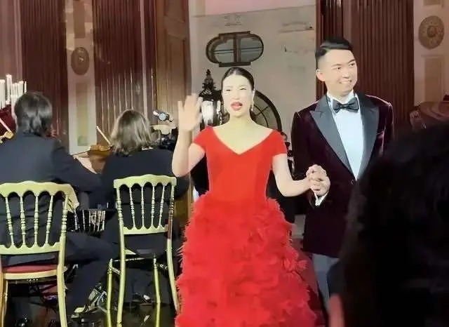 作为当天的女主角,雷正殷身着一袭华丽的红色长裙亮相,而她的丈夫则选了一套酒红色西装,与整体婚礼的色调相得益彰。雷正殷化着精致妆容登场,并在走向舞台的过程中与亲朋好友热情打招呼。有细心的网友发现,她脖子上戴着的一条璀璨的钻石项链,显得格外耀眼,肯定是一件价值不菲的珠宝。
